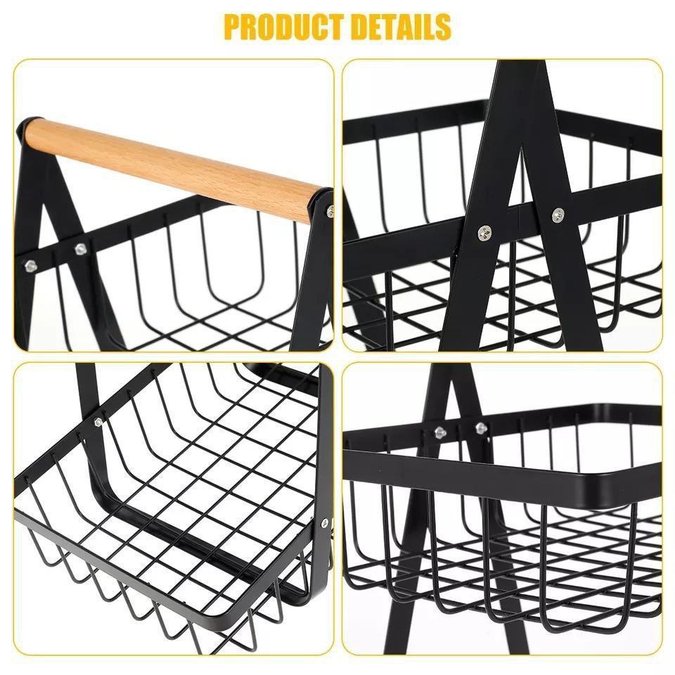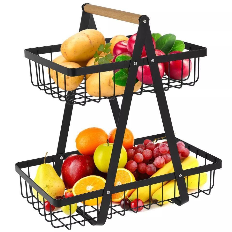 حامل وسلة بطبقتين قابل للفصل مصنوع من الستانلس ستيل عالي الجودة باللون الأسود، مثالي لتنظيم الفواكه والخضروات والخبز والوجبات الخفيفة في المنزل