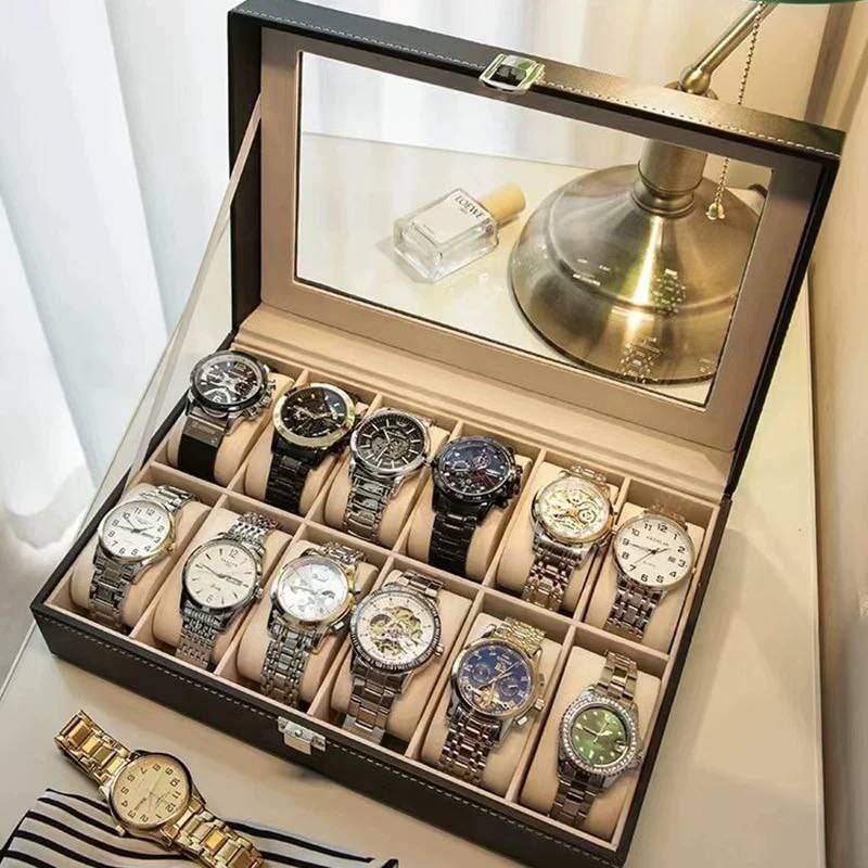 صندوق منظم تخزين للساعات 10 خانة و 12 خانة لعرض الساعات أسود جلد صناعي