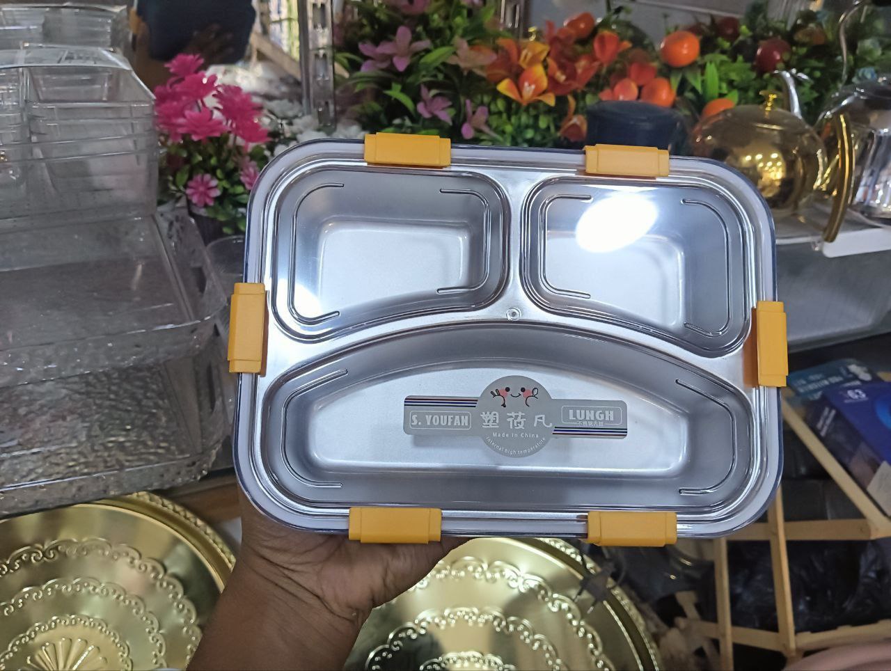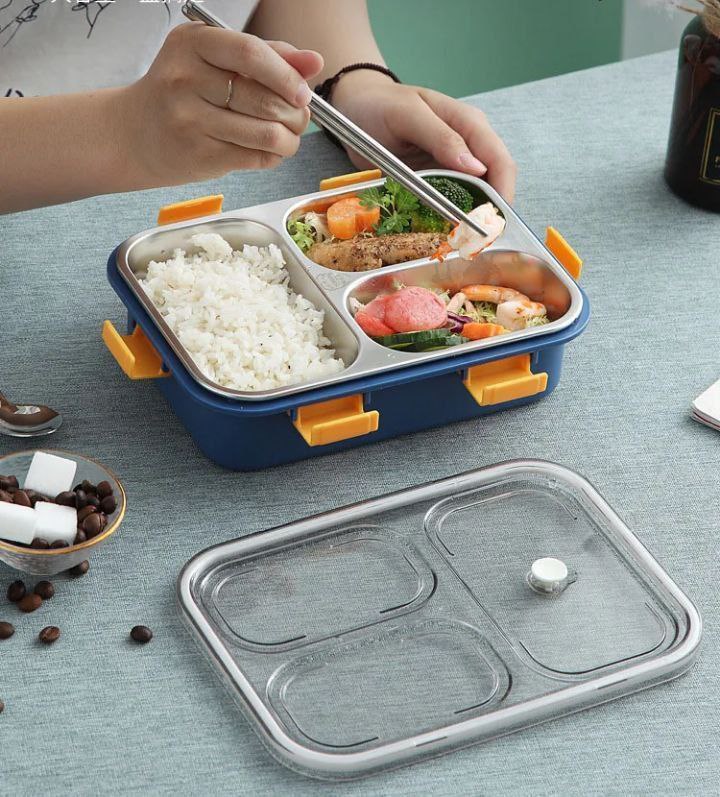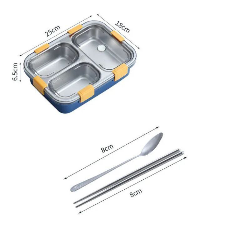 لانش بوكس استلس من الداخل مقسم محكم الغلق مزود بمعلقه استلس + 2 عود طعام استانليس